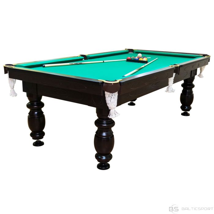 Galda izmērs pēdās: 8' Galda izmērs: 253x141x80 cm Spēles laukuma izmērs: 224x112 cm Ieteicamais telpas izmērs: 520x408 cm Spēles laukums: laminēta skaidu plātne Klasisks zaļš biljarda audums Galda krāsa: brūna (venge)