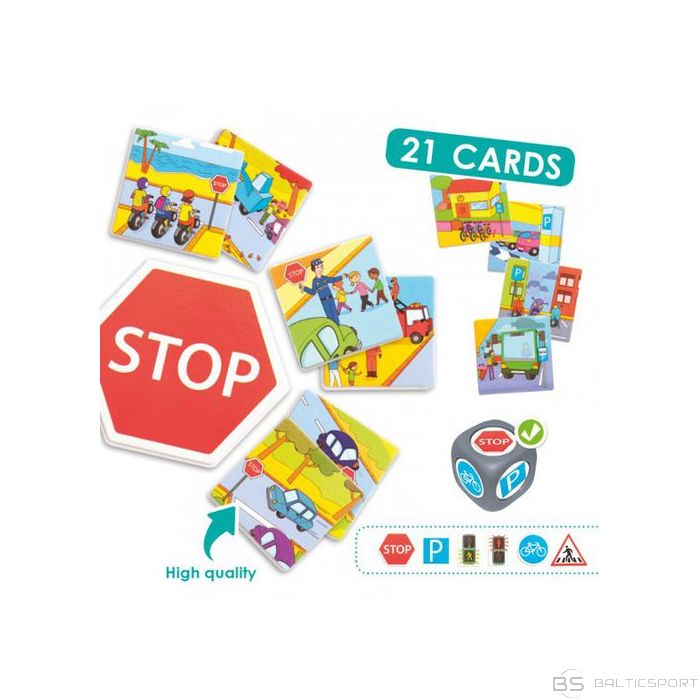 | Met metamkauliņu un savieno ceļa zīmes ar tām atbilstošajām situācijām! Šī būs tava pirmā ceļu drošības nodarbība!Spēle sastāv no 6 lielajām piecstūru kartiņām, kurās attēlotas ceļa zīmes, un tām jāpievieno 6 mazās kartiņas ar atbilstošām situācijām uz ceļa. Katram kartiņu komplektam aizmugure ir vienādā krāsā, lai varētu sevi pārbaudīt.- 6 lielās ceļa zīmju kartiņas- 21 mazā kartiņa- 1 liels metamkauliņš (3,5 cm katra plakne)Vecums: 3+*Izgatavots no dabai draudzīga materiāla |